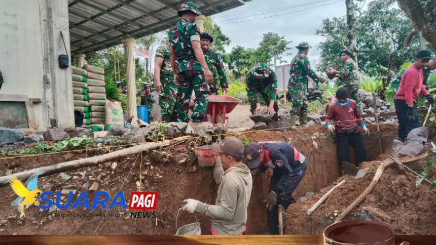 Wonogiri - Salah satu wujud nyata kemanunggalan TNI dengan rakyat dalam mendukung percepatan pembangunan di wilayah pedesaan. Melalui program ini, TNI bersama masyarakat terus bergotong royong membangun sarana dan prasarana yang bermanfaat bagi peningkatan kesejahteraan warga. Hal itu tampak jelas di Desa Kembang, Kecamatan Jatipurno, Kabupaten Wonogiri, dimana adukan semen dan tumpukan batu terus dikerjakan untuk pembangunan talud masjid dengan…
