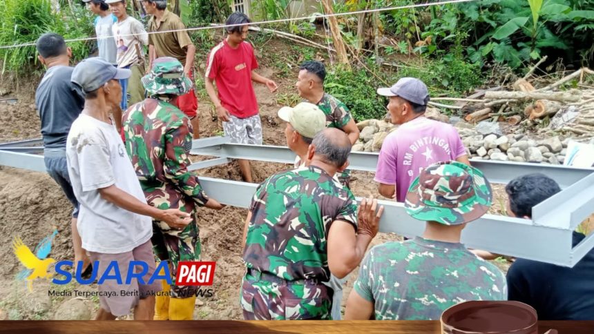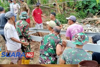 Banyumas – Suara cangkul yang menghantam tanah berpadu dengan gemericik air sungai yang mengalir tenang di Desa Kalibagor, Kecamatan Kalibagor. Di RT 01 RW 03, pagi yang cerah menjadi saksi bagaimana harapan mulai dibangun dari tepian sungai. Prajurit Kodim 0701/Banyumas berdiri berdampingan dengan perangkat desa dan masyarakat, merintis pembangunan Jembatan Gantung Perintis Garuda. Jembatan sepanjang 20 meter dengan lebar 1,2…