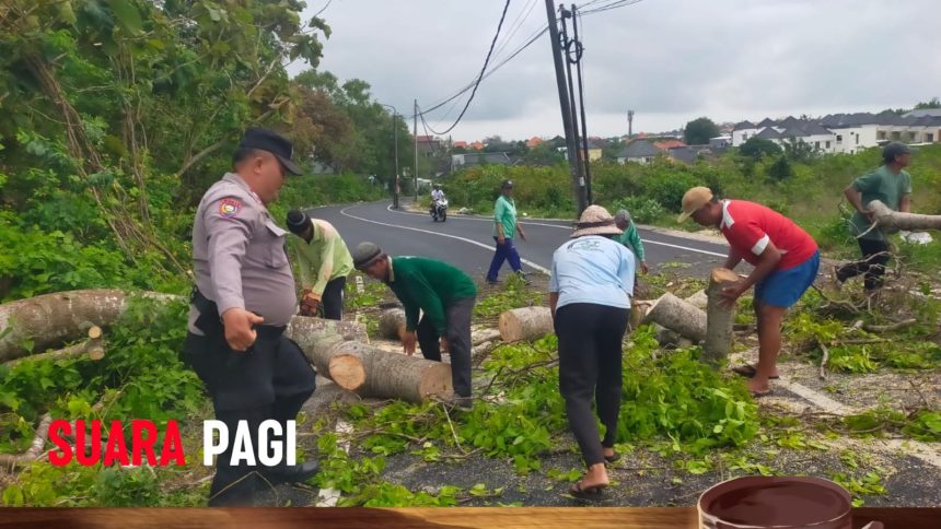 Benoa – Bhabinkamtibmas Kelurahan Benoa bersama Dinas Kebersihan dan Pertamanan (DKP) Kelurahan Benoa, Kepala Lingkungan Banjar Menesa, Linmas, serta warga sekitar bergotong royong melaksanakan penanganan pohon tumbang yang menutupi akses jalan di Jalan Dukuh Sari, Lingkungan Menesa, Desa Adat Kampial, Kelurahan Benoa, Senin (30/9).