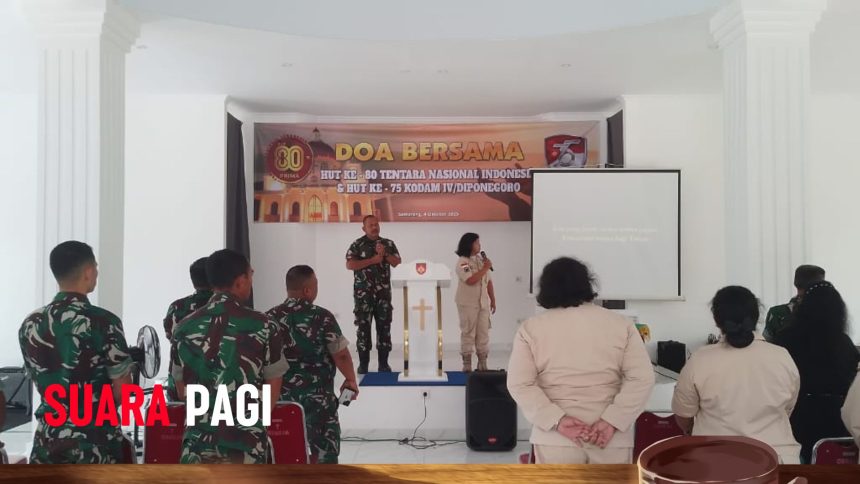 Semarang – Dalam rangka memperingati Hari Ulang Tahun ke-80 Tentara Nasional Indonesia (TNI), Kodam IV/Diponegoro menggelar doa bersama lintas agama pada Sabtu (4/10/2025). Kegiatan ini dilaksanakan secara serentak di lingkungan Kodam IV/Diponegoro, sesuai dengan agama dan keyakinan masing-masing, di mana umat Islam berdoa di Masjid Al-Firdaus, umat Kristen Protestan di Gereja Oikumene, umat Katolik di Ruang Rapat Bintaljarahdam, dan umat Buddha di Ruang Persit Bintaljarahdam.
