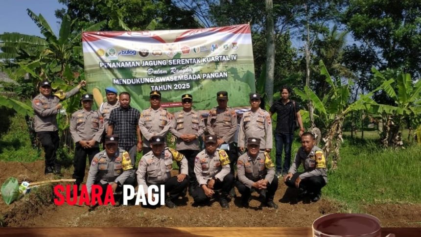 Suasana kebersamaan tampak jelas dalam kegiatan tersebut, di mana jajaran Polri, TNI, dan masyarakat bergotong royong menanam jagung di lahan pertanian Noborejo.