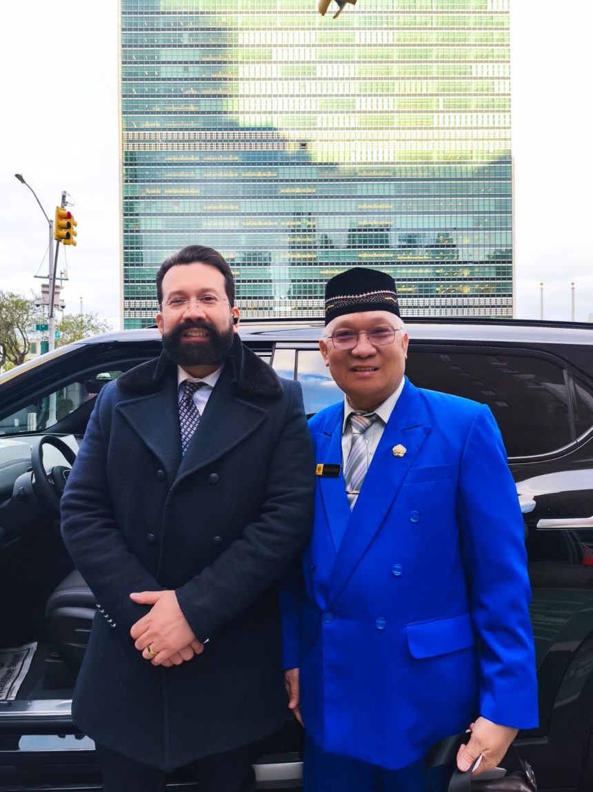 New York, 10 Oktober 2025 – Momen menarik terjadi di depan Gedung Perserikatan Bangsa-Bangsa (PBB), New York, Amerika Serikat, pada Jumat (10/10/2025). Seorang jurnalis Indonesia berkesempatan bertemu dengan dua reporter dari US TV Correspondence, salah satu media internasional yang rutin meliput kegiatan diplomatik dan isu global di markas besar PBB.