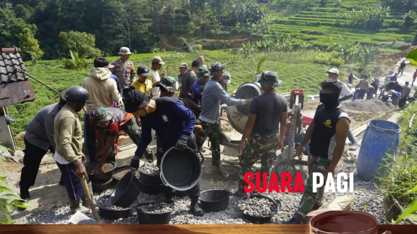 Karanganyar – Semangat gotong royong tampak nyata dalam kegiatan TNI Manunggal Membangun Desa (TMMD) Reguler ke-126 Kodim 0727/Karanganyar yang digelar di Desa Bandardawung, Kecamatan Tawangmangu. Anggota TNI bersama Polri dan masyarakat bahu membahu melaksanakan pengecoran jalan desa yang menjadi salah satu sasaran fisik utama program TMMD kali ini. Tampak personel TNI dan warga setempat bekerja tanpa kenal lelah mengangkut material dan meratakan adukan semen meski di bawah terik matahari.