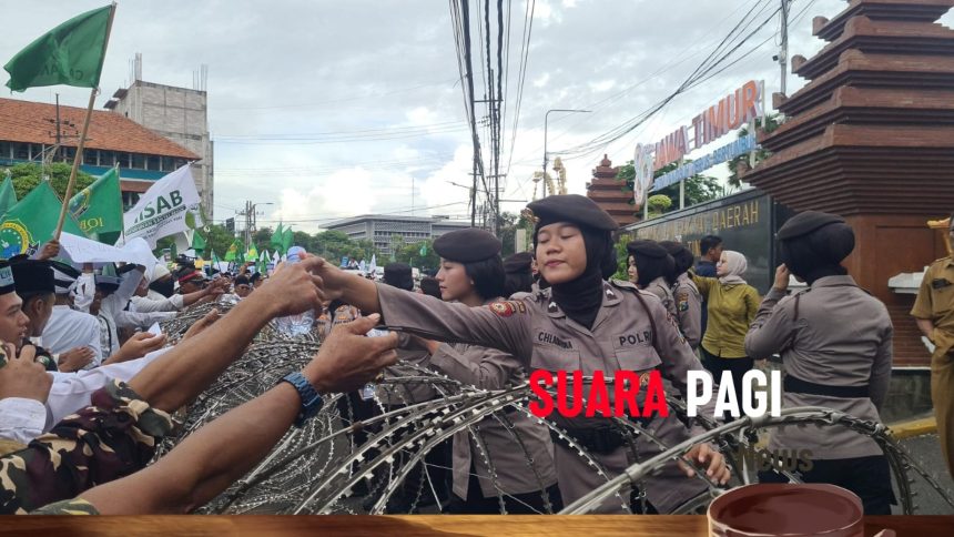 SURABAYA – Ribuan santri dari berbagai pondok pesantren di Jawa Timur menggelar aksi damai di depan Gedung DPRD Provinsi Jawa Timur, Surabaya, pada Selasa (21/10/2025).