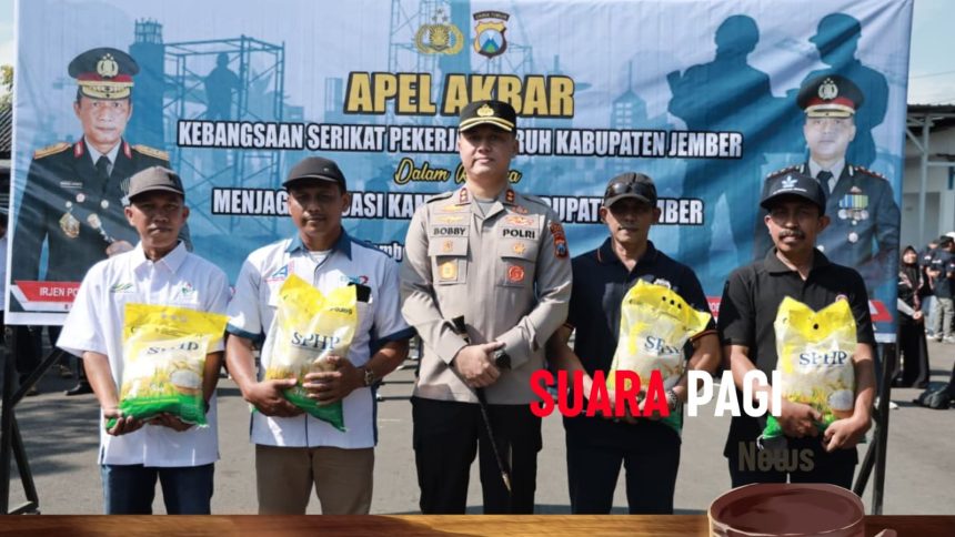 Jember, – Lapangan Satpas Lalu Lintas Sumbersari, Jember, pagi ini jadi lautan semangat kebangsaan. Ratusan buruh dari berbagai organisasi seperti SPSI dan Sarbumusi Jember mengikuti Apel Akbar Kebangsaan Serikat Buruh, yang dipimpin langsung oleh Kapolres Jember AKBP Bobby A. Condroputra. Kamis, (23/10/2025)