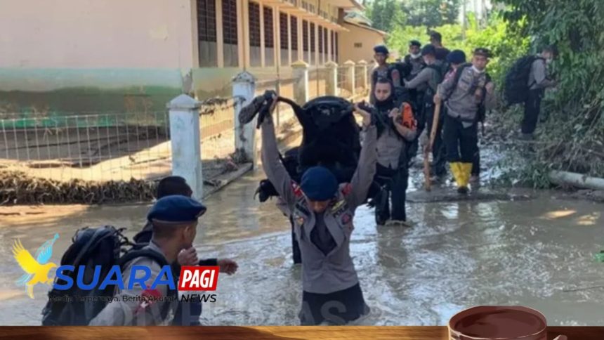 Pidie Jaya – Personel Brimob Polda Aceh menembus banjir ekstrem yang memutus akses menuju dua desa di Kecamatan Meureudu, Pidie Jaya, Sabtu (29/11). Dengan berjalan kaki selama dua jam melalui jalur berisiko tinggi, pasukan Brimob berhasil menyalurkan bantuan logistik sekaligus mengevakuasi seorang lansia yang sedang sakit dari wilayah yang terisolasi.
