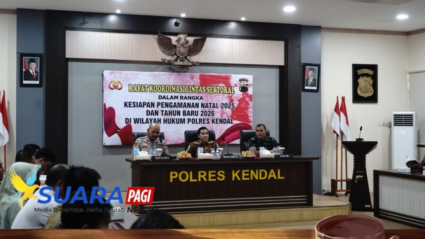 KENDAL — Polres Kendal menggelar rapat koordinasi lintas sektoral dalam rangka kesiapan pengamanan perayaan Natal 2025 dan Tahun Baru 2026 (Nataru) di wilayah hukum Polres Kendal. Kegiatan berlangsung di Aula Tribrata Polres Kendal, Kamis (18/12/2025) pagi, dan dihadiri unsur Forkopimda, TNI, instansi penegak hukum, OPD, hingga jajaran kepolisian.