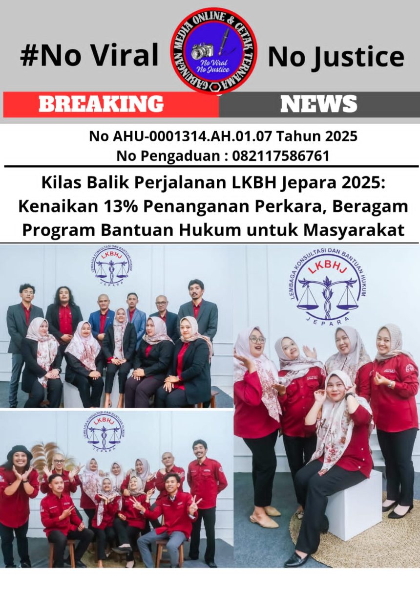 JEPARA, 22 Desember 2025 (GMOCT) – Lembaga Bantuan Hukum (LKBH) Jepara yang dipimpin Direktur Muh Yusuf.SE.,SH.,MH.,C.Med.,C.LSc merayakan perjalanan kerja yang produktif sepanjang tahun 2025. Terbukti dengan kenaikan penanganan perkara sebesar 13% dibandingkan tahun 2024, mencakup perkara pidana, perdata litigasi, dan non-litigasi.