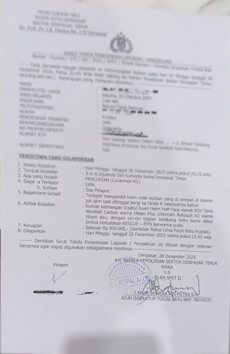 Denpasar,Suara paginews.com sudah ber jalan nataru Aksi pencurian helm kembali terekam di kamera CCTV depan kantor BPBD renon dan.sialnya pelaku pencurian helm juga sempat terekam di kamera CCTV pencuri helm di lokasi jalan Ir.H.Djuanda sari Sumerta Kelod Denpasar timur Renon Depan kantor BPBD Melalui kamera kantor BPBD terlihat jelas seorang pelaku mencuri helem.dan pelaku dengan mengendarai sepeda motor berhenti di sebuah parkiran depan kantor.salah satu tempat yang menjadi target pencurian helm tersebut di daerah Renon Denpasar.pada Minggu malam(28/12/2026).