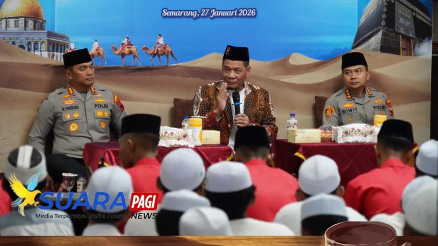 Semarang — Personel Polrestabes Semarang menggelar peringatan Isra Mi’raj Nabi Besar Muhammad SAW 1447 Hijriah/2026 Masehi di Masjid Al Hidayah Polrestabes Semarang, Selasa (27/1/2026) pagi. Kegiatan ini mengusung tema “Isra Mi’raj Nabi Muhammad SAW Memperteguh Keimanan dan Ketaqwaan Personel Polri untuk Masyarakat dalam Aksi Kemanusiaan dan Kepedulian Sosial.”