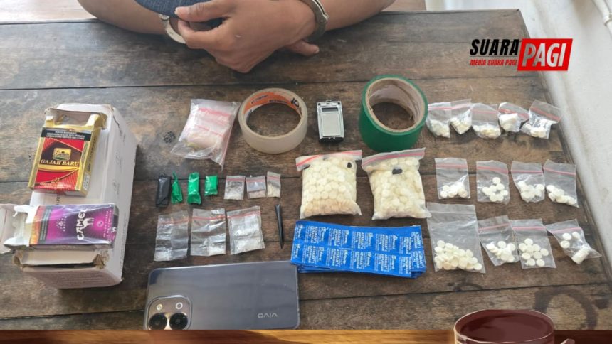 ” Dalam penangkapan tersebut petugas kami menemukan berbagai barang bukti yang disimpan di dalam rumah, di antaranya 10 paket sabu dengan berat bruto 4,81 gram, 6 lempeng psikotropika jenis Alprazolam (ATARAX) sebanyak 60 butir, serta 941 butir obat jenis Yarindo. Selain itu turut diamankan timbangan digital dan plastik klip ” tambahnya