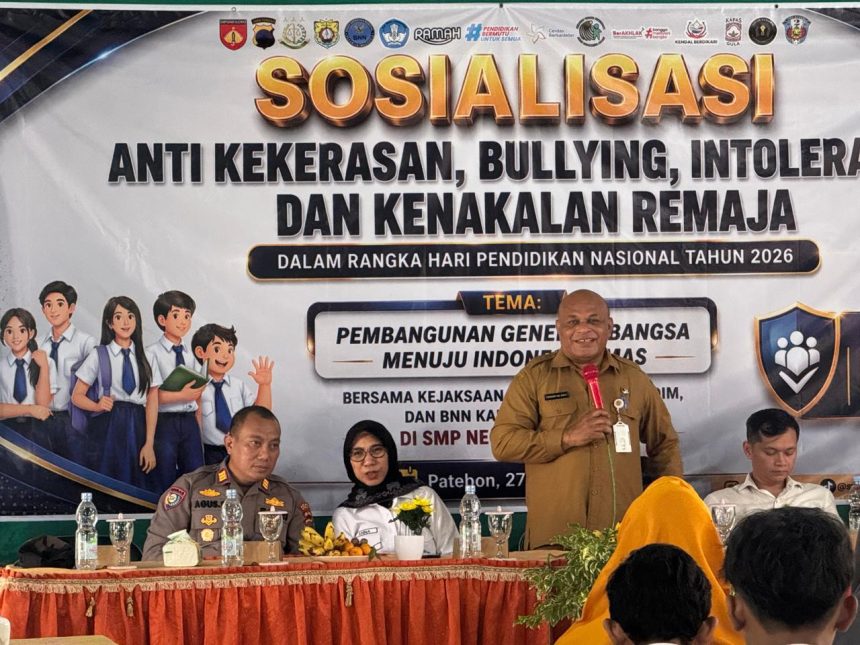 KENDAL — Satuan Pembinaan Masyarakat (Sat Binmas) Polres Kendal menggelar sosialisasi anti kekerasan, bullying, intoleransi, dan kenakalan remaja di SMPN 2 Patebon, Kabupaten Kendal, Senin (27/4/2026) pukul 09.30 WIB. Kegiatan ini menghadirkan sejumlah unsur pemerintah daerah dan diikuti pelajar serta guru dari beberapa sekolah.