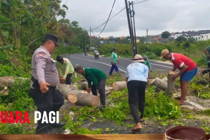 Bhabinkamtibmas kelurahan Benoa bersama warga tangani pohon tumbang